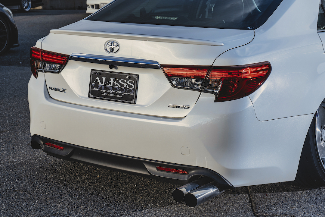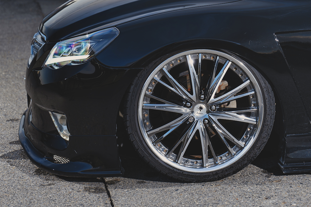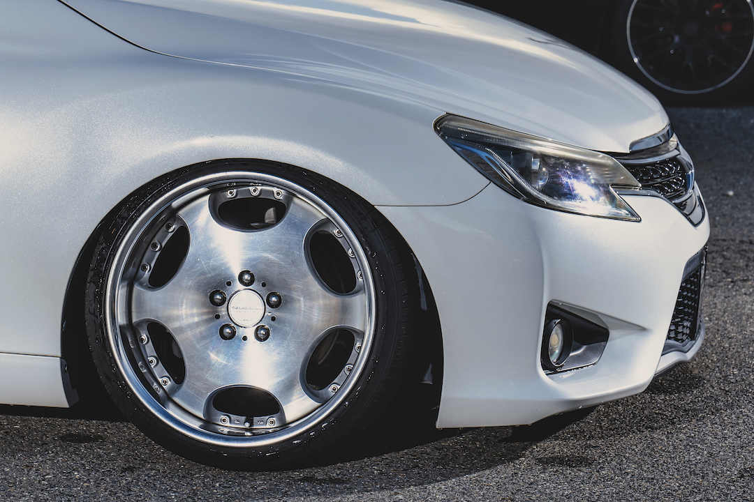 他の人と被りたくない。そんな個性を求めている方にオススメのマークX。あえて後期仕様にせず、前期のままなので、前期のルックスが好きっていう方にもオススメです。人気足まわりメーカーのイデアルのエアサスが入っているのもポイント。ホイールも3ピースのクレンツェ。かなりレベルの高いカスタムが施されています。エアロはフロントがモデリスタで、リアはワンオフです。リアは4本出しのマフラーカッターがタテに収められていて、これはなかなか珍しいデザイン。レクサスの「F」とか、本格的なスポーツモデルを彷彿させます。フロントの顔付きも、リアに負けず劣らず、迫力満点。ヘッドライトは3眼のレクサスルック。フォグランプ部分もカスタムしてあります。純正とは全然違う、唯一無二のルックスに仕上がっていると思います。