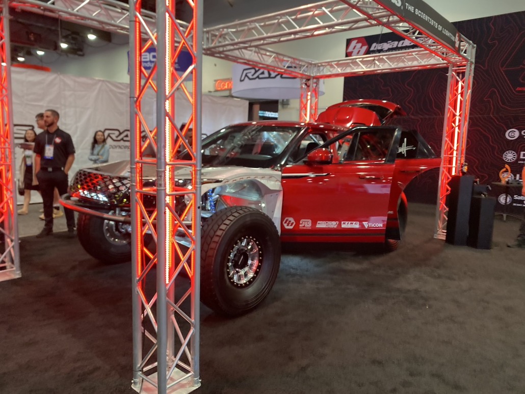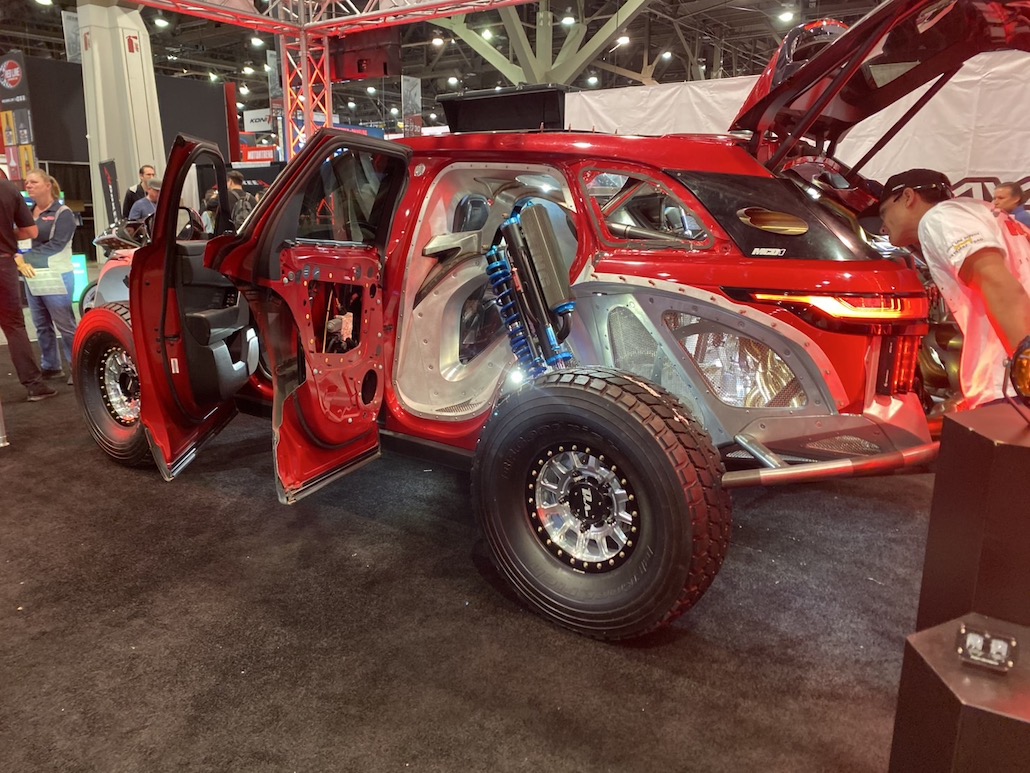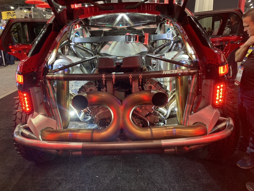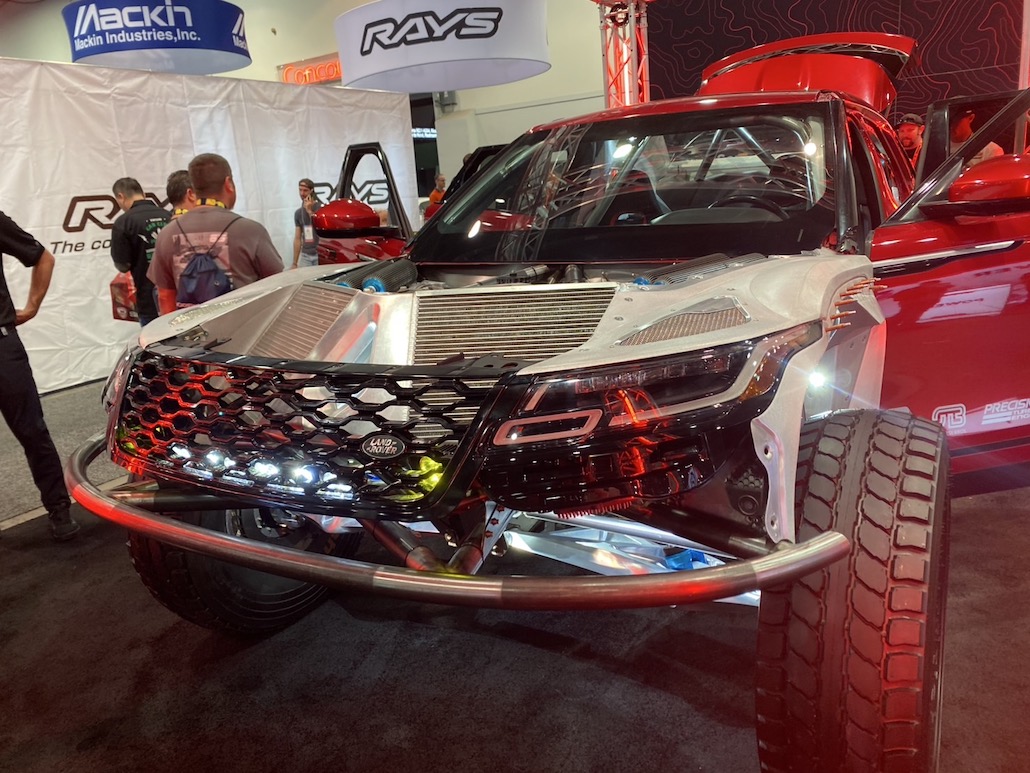 今年のセマショーで最もクレイジーな高級プレランナーが、2000馬力のランボルギーニV10ツインターボエンジンを搭載したレンジローバー ヴェラール。本来、プレランナーとは「試走車輌」という意味で、レース本番前にコースを視察するために使用する車輌のこと。しかし、この車輌はこの姿が完成形で、プレランナー仕様としてカスタムされていると思われる。足まわりもマフラーもフロアも、とにかく、中を全部見せる。とても斬新で凄かったです。