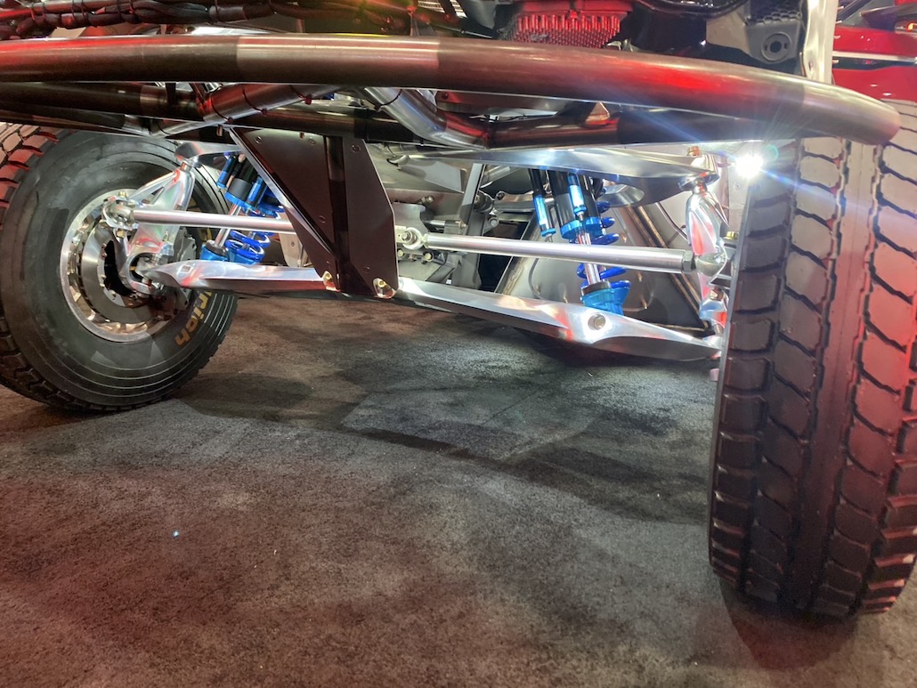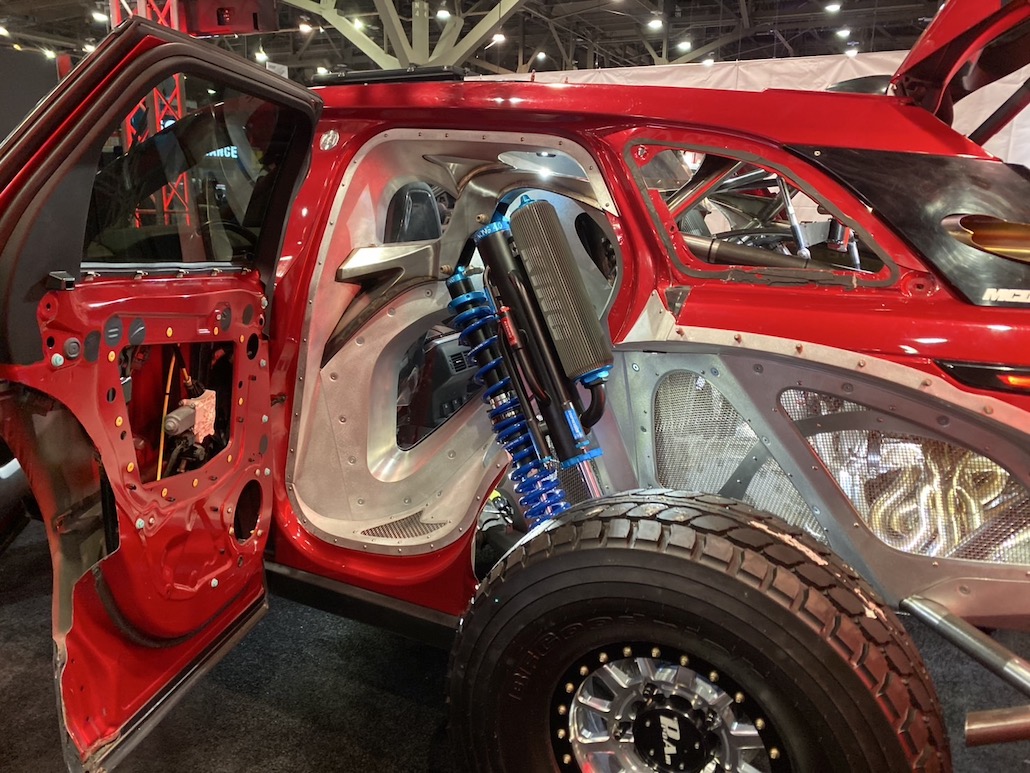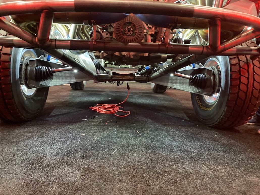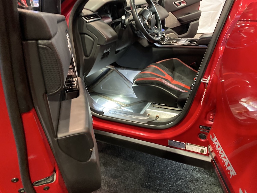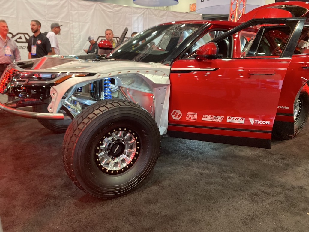 今年のセマショーで最もクレイジーな高級プレランナーが、2000馬力のランボルギーニV10ツインターボエンジンを搭載したレンジローバー ヴェラール。本来、プレランナーとは「試走車輌」という意味で、レース本番前にコースを視察するために使用する車輌のこと。しかし、この車輌はこの姿が完成形で、プレランナー仕様としてカスタムされていると思われる。足まわりもマフラーもフロアも、とにかく、中を全部見せる。とても斬新で凄かったです。