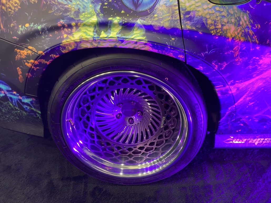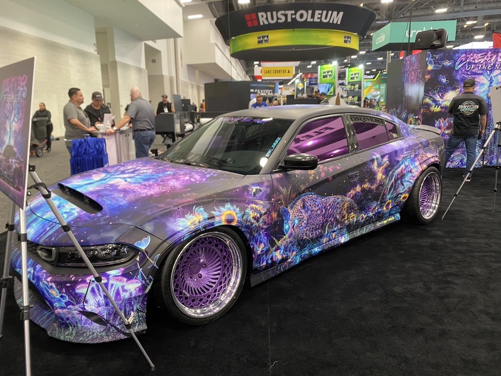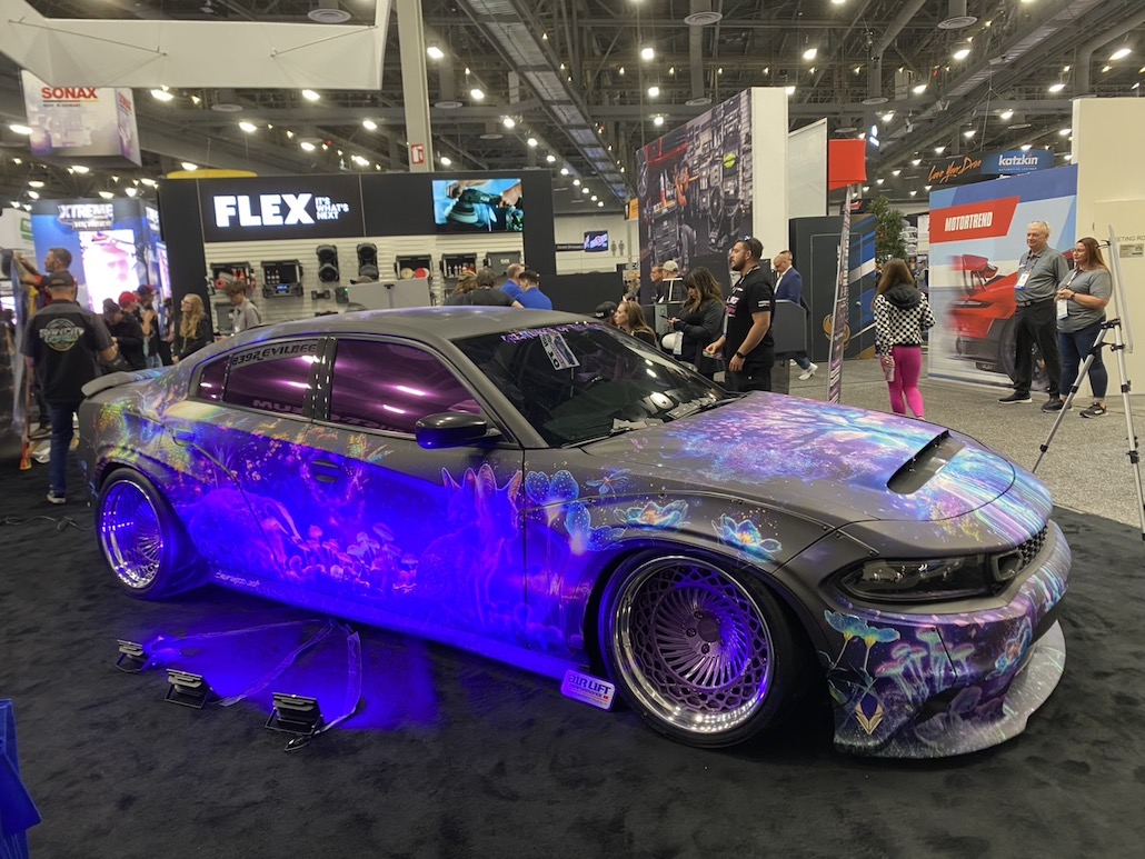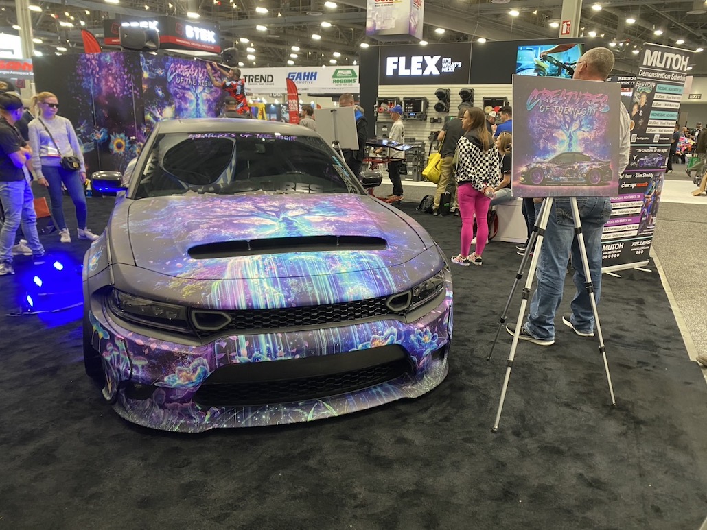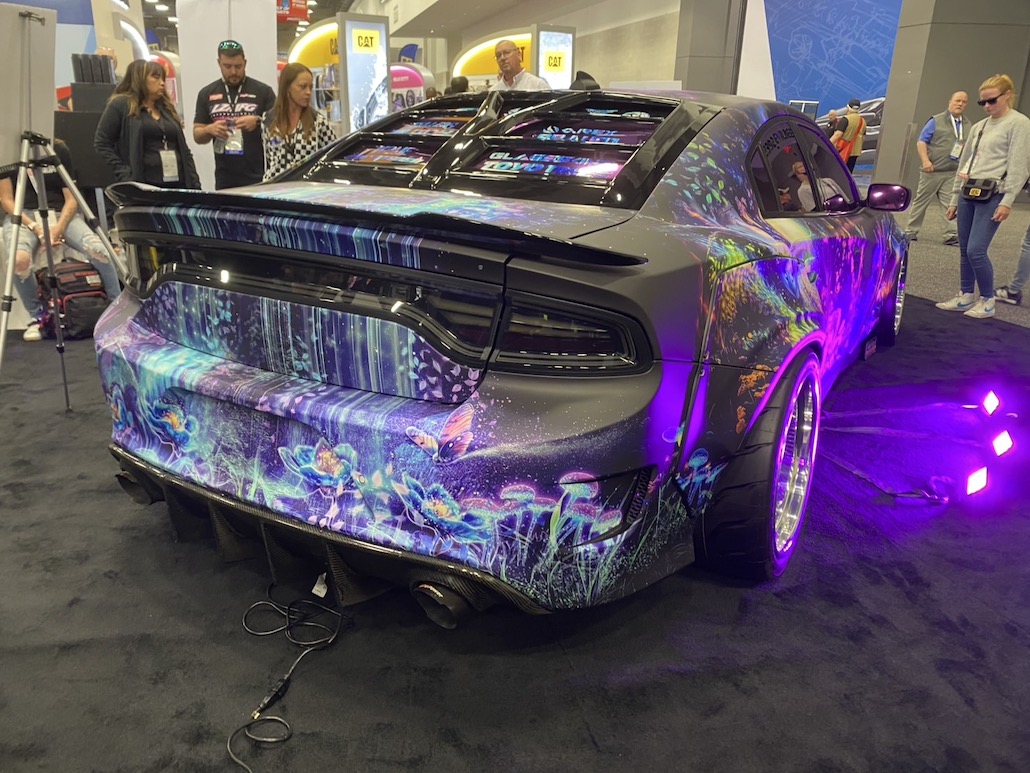 最先端のラッピングを披露し、アート性を醸し出していたダッジ チャージャー。夜の闇の精霊たちと大自然からインスピレーションを得た、他に類を見ないラッピング。3つの異なる視覚効果がポイントで、「フルリフレクティブプリント」と「ブラックライト反応」と「RGB 3Dライト反応」がカギとなる。クルマをキャンバスにした芸術作品的な雰囲気。今回のセマショーでアート性はナンバー1でした。