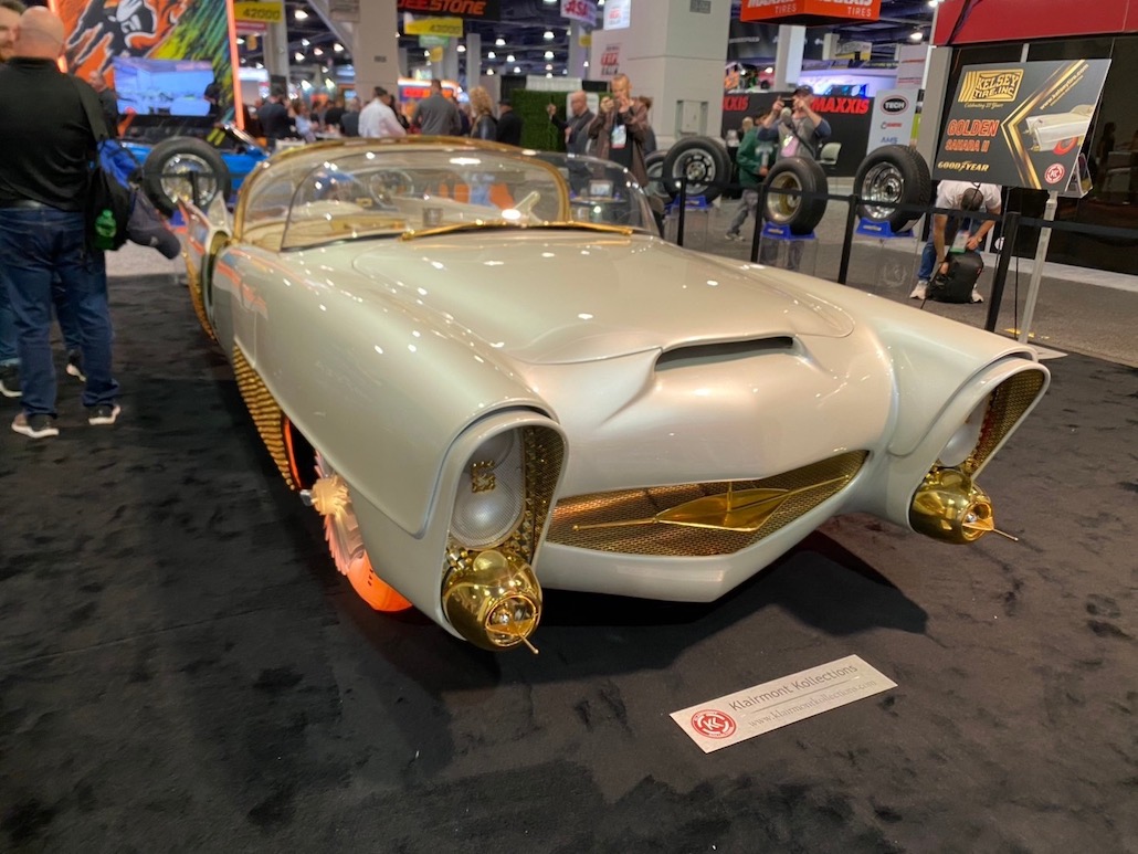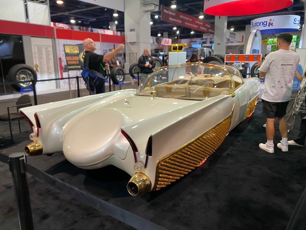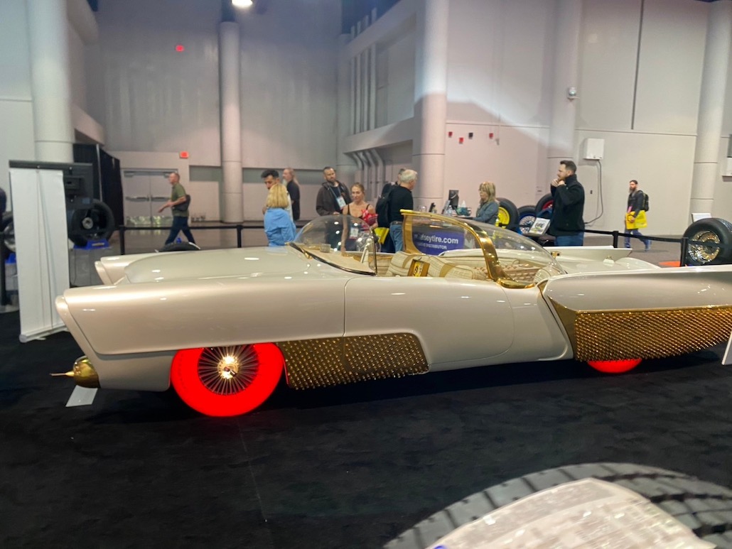 通称・ゴールデン サハラⅡと呼ばれるリンカーン カプリ。アメリカのクルマ好きなら誰もが知っている名車で、1960年のナショナル チャンピオンシップ カスタムカーショーでアワードを獲得し、その後、数々の映画やテレビに登場していたそう。現仕様のボディカラーは艶のあるホワイト。このホワイトカラーは貝殻を砕いて作られたとのこと。本当のパールっていうか、宝石の真珠のようで凄くキレイでした。とにかく贅沢で、ゴールドのトリム、キャビンにはビルトインのテレビ、冷蔵庫に、カクテルバーまで装備。そして、タイヤ。これは1950年代に光るタイヤを製造していたグッドイヤーがプロジェクトに協力し、復刻版タイヤを作り上げたそう。ちなみに、このタイヤで自走も可能らしい。