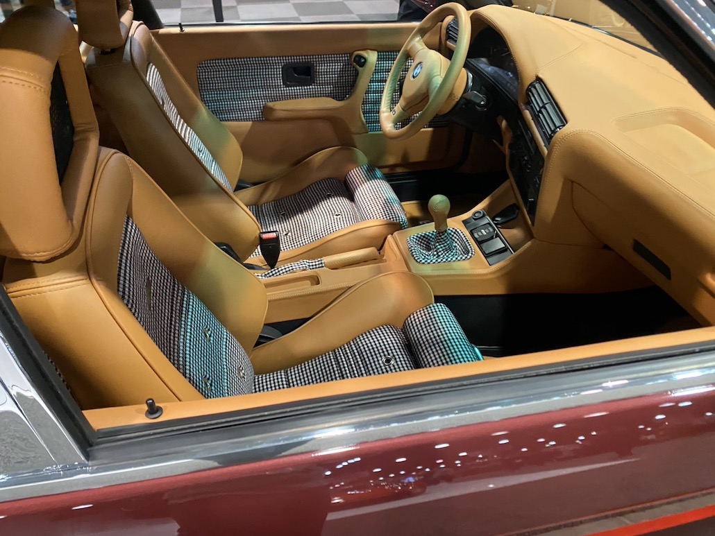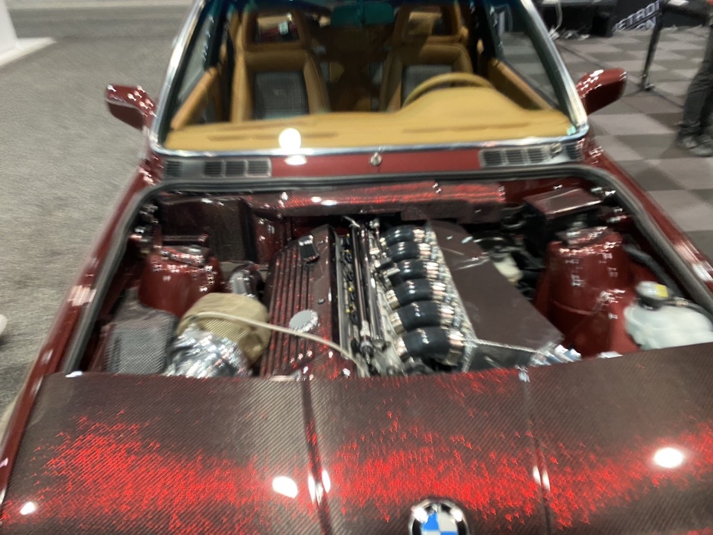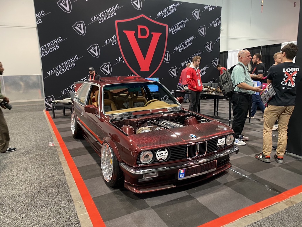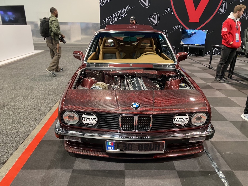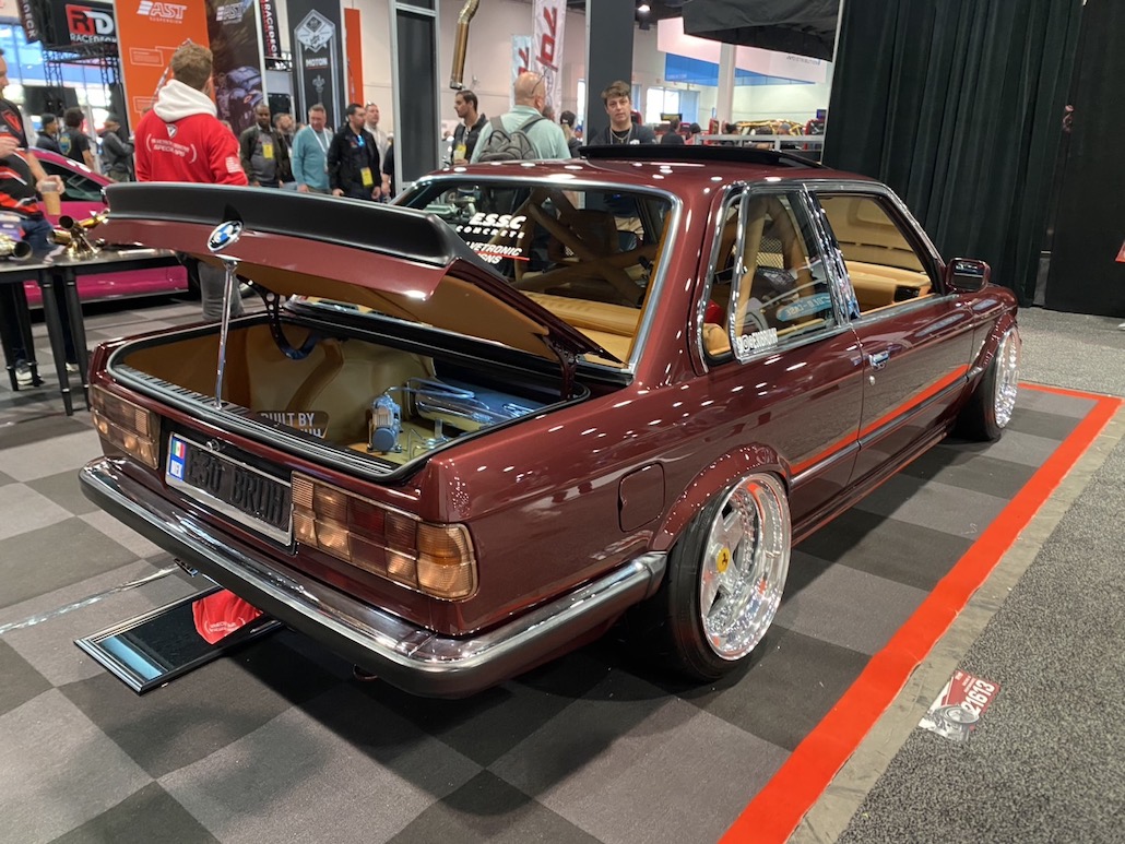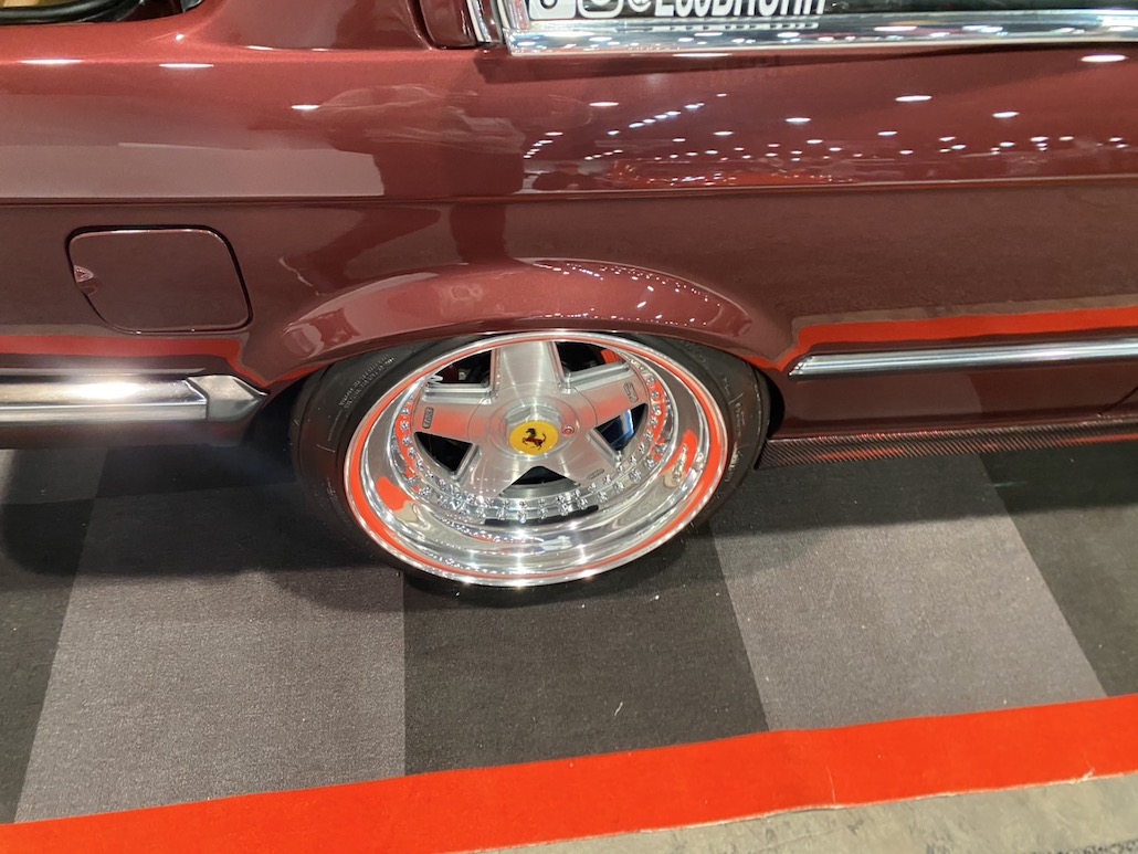 E30に、フェラーリ テスタロッサのホイールを履かせた驚きの仕様。アメリカらしく、エンジンにも手を入れており、6266シングルターボ付き仕様に変貌。カーボンパーツを使っているのも必見。僕らがいいなって思ったのは、全体のバランスがとれていること。こっちのクルマは何かに特化してしまうことが多い。だけど、このBMWは全体のバランスを重視していて、何となく日本のVIPのマインドと似ているなって思いました。ツライチもVIPっぽいし、ボディカラーも渋くてカッコ良いし。他にも同じE30で話題を集めていた車輌がありましたけど、僕はこっち。とても美しい作り込みで良かったです。