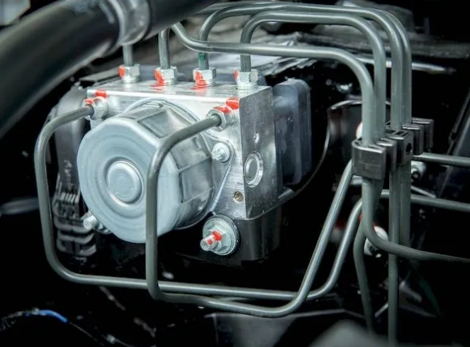 「細いブレーキパイプが何本も集中してるターミナルみたいな場所だから、エンジンルームを開ければすぐ見つかる。コレです。ABSアクチュエーターと呼ばれます」